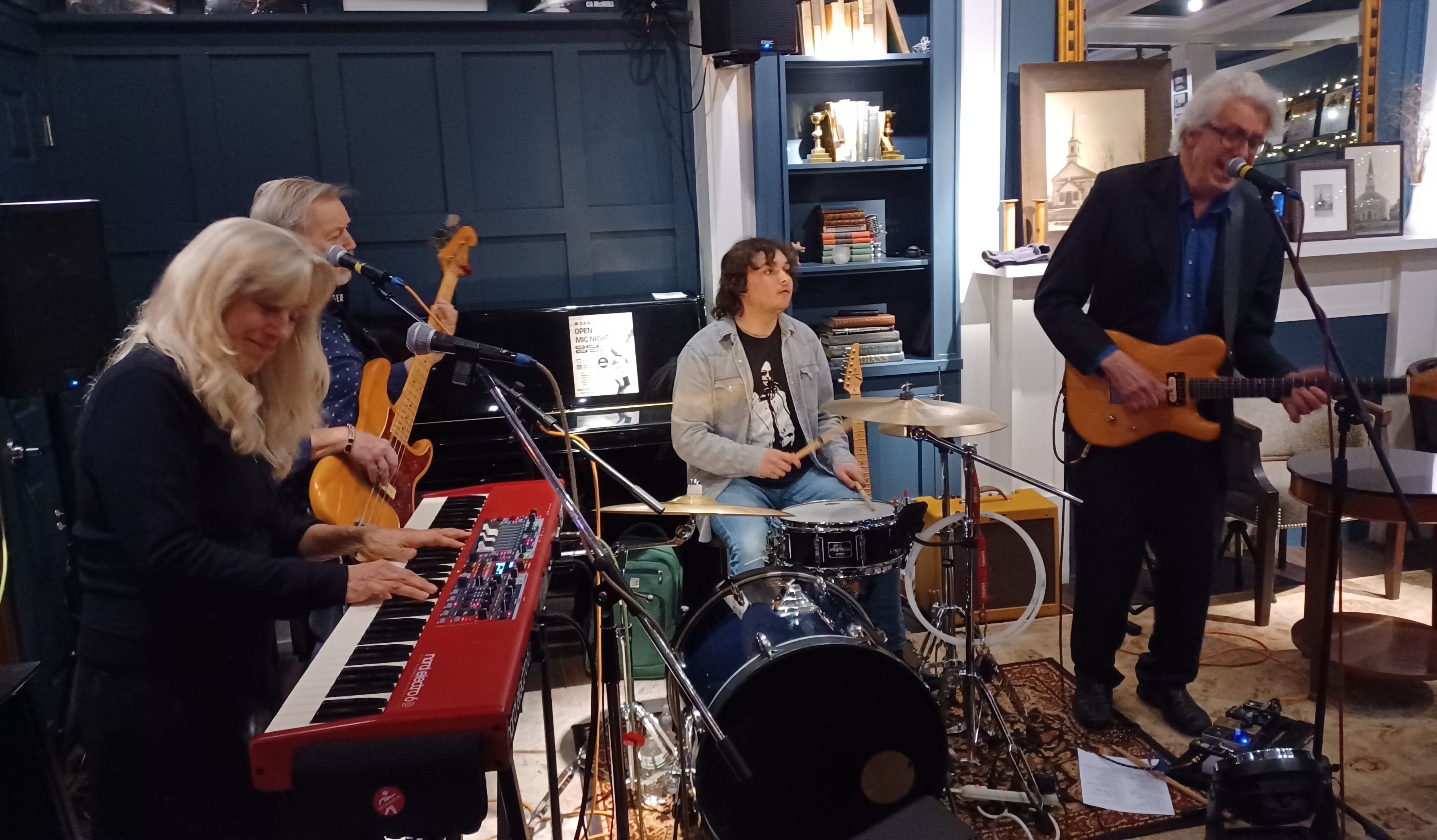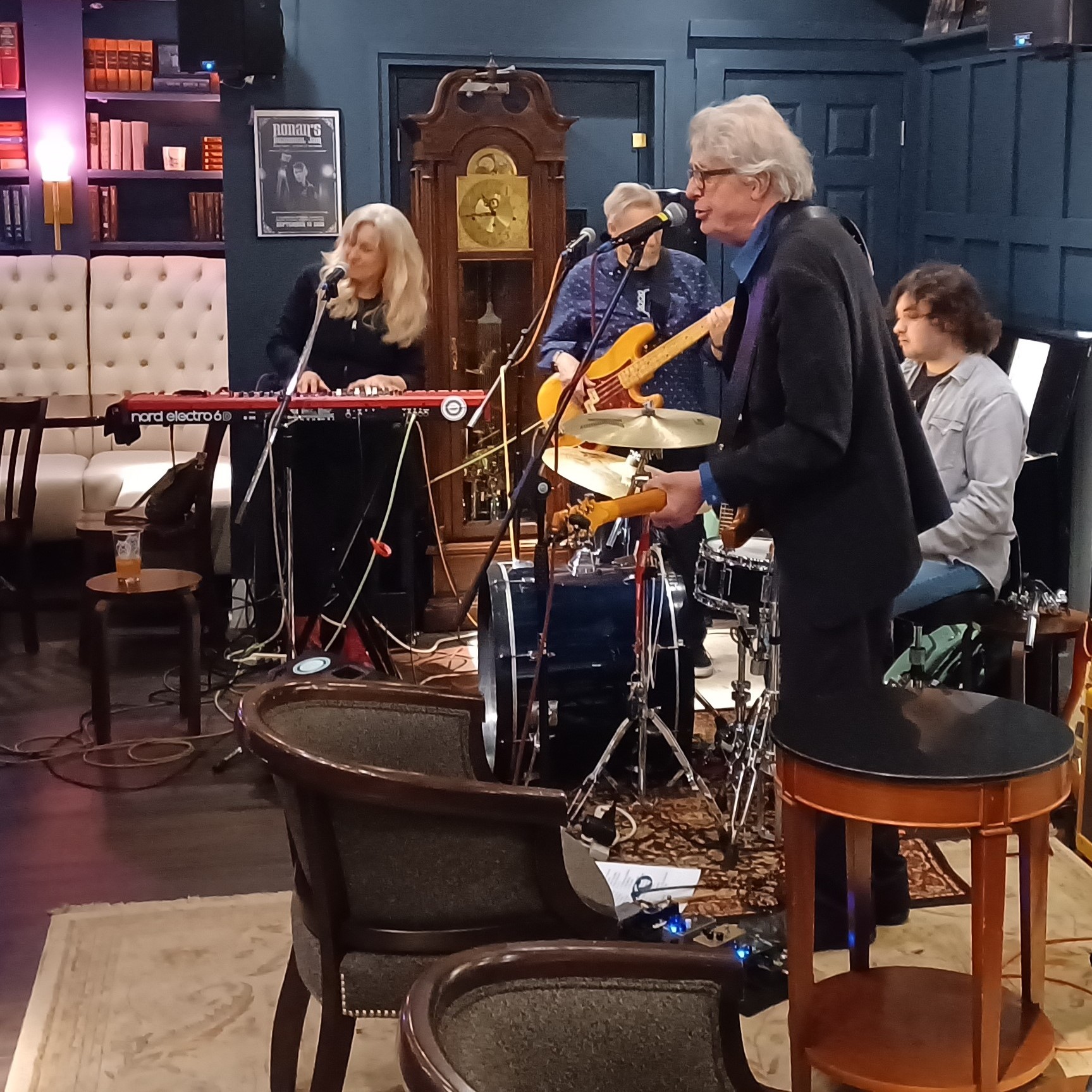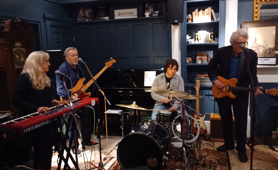 Last night, the Bees Deluxe lineup was comprised of three of its core members – Carol Band (keys), Conrad Warre (guitar), and Matt Arenburg (drums) – plus Allyn “Aldo” Dorr, who you’ll find listed on the “musical guests and friends” section of the “musicians” page of the band’s website. A couple times during the set, the quartet became a quintet, as they were joined by special guest Keith Lanzilotti on harmonica.