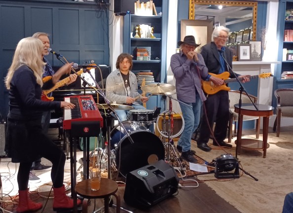 The next few songs included several originals, including “You Say Red,” a smooth number that is a little softly rollicking, if you believe a “rollick” can be soft. It was followed by a number whose title I missed but that’s worth mentioning because it featured simultaneous atmospheric and psychedelic vibes, a combo that runs through a lot of Bees Deluxe’s music. Also worth noting in this run were a great rendition of “I Wouldn’t Treat a Dog (The Way You Treated Me),” which you’ll find on the band’s Smash Hits disc (follow the link to Eric’s review, which I shared in the first paragraph). It also featured the first appearance of guest harmonica-wiz Lanzilotti and a couple more originals – lean-back-and-soak-up-the-vibe number “Wherever You Hide” and “Queen Midas,” a kind-of-groovy, psychedelic personal favorite of mine from the Hallucinate album that features an aggressive approach to its chorus.